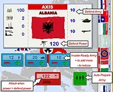 Defend power of Albania is 300, when opponent lands on it, he/she will lose an amount of army equal to 90 power;