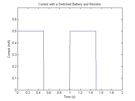 In this circuit, the switch is turned on (closed) and off (open) every half second. Once again, the current travels in the direction of the arrow. The current does not go negative; it thus travels in one direction only. However, it is not constant and is thus considered to be alternating current.