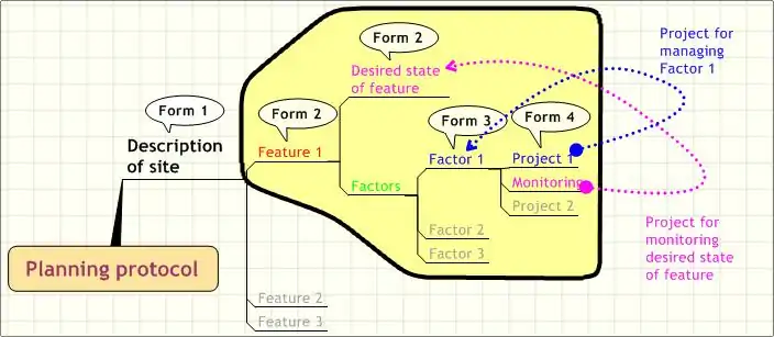 identifying and describing, in a standard way, all the tasks required to control the key factors (positive of negative), which influence the condition of the features, and thereby maintain the features in a favourable condition; producing and budgeting various work programmes to control the factors, for example five-year plans, rolling- plans, annual schedules, financial schedules, and work schedules for specified categories of staff; providing a site/species monitoring system to check the effectiveness of the plan against the specified objectives; facilitating the exchange of management information by reporting, within, and between, sites and organisations; using feedback from monitoring to improve the management system. The sequence of identifying features, setting objectives, and then selecting the factors to be controlled by projects with scheduled work plans, comprises a management plan.