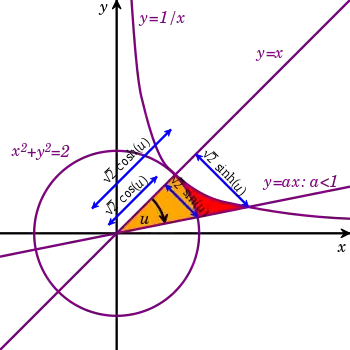 Note the axis of symmetry L: x = y of the hyperbola xy = 1. A point (x, 1/x) on the hyperbola determines a hyperbolic sector S(1,x) delimited by L, the hyperbola, and the line from (0,0) to the point. The perpendicular projection from the point to L establishes the hyperbolic sine, sinh v, where v is the area of the sector S(1,x), commonly called the hyperbolic angle. The foot of the projection determines cosh v by the length of the diagonal from (0,0) to the foot. In accord with a circle of area 2π, the sinh and cosh are normalized by a factor of √2.