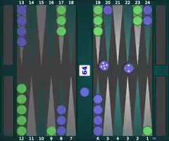 A few turns from the beginning of a sample game will illustrate the rules of movement. To start the game, blue rolls a 4 and green rolls a 1, so blue takes the first turn playing a 4-1. This is an unfavorable opening roll, arguably the worst possible, but blue uses it the best he can. He takes a checker from each of his heavy points by playing 13/9 6/5 (from the 13-point to the 9-point, and from the 6-point to the 5-point).