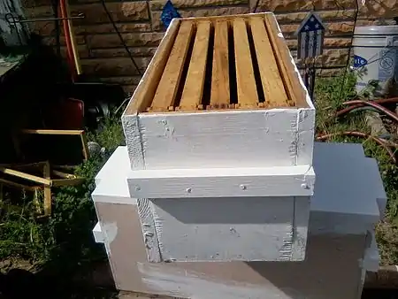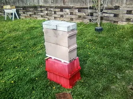 The hive is a vertical hive system much like the Langstroth hive in that boxes are stacked vertically and harvested from the top down. However, the management of the hive requires adding new boxes to the bottom of the stack (nadiring) as opposed to adding them to the top of the stack (supering).