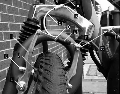 |  Fig 1. Typical Brake Details A. Cable Housing. B. Housing End Ferrule. C. Cable Guide. D. Housing Detent. E. Rubber Noodle. F. Cable Clamp. G. Cable Tail. H. Cable Cap. I. Brake Arm J. Brake Block (Pad). K. Block Setting Screw. L. Arm Mounting Bolt. |