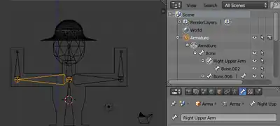 Now, just to make things easier, we're going to name the bones. For example, my bones are named "Right Forearm", "Left Forearm", "Right Upper Arm", etc. While in Edit mode, select the bone you want to rename. In the Outliner  , the bone you have selected will be visible with a circle around it