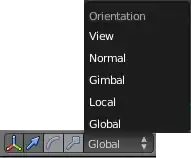Transform orientations: the “Orientation” menu governs how the axes of the manipulator are aligned, with the default “Global” corresponding to the global coordinate system. Other useful options are “Local”, which corresponds to the local coordinates system of each object, and “View”, which is always aligned to your view.