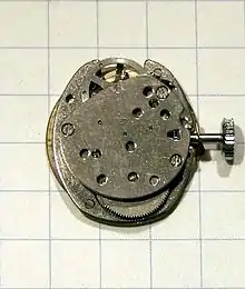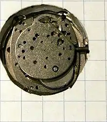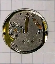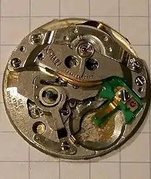 Base movement Model 24 has an oval-rectangular dial plate, and a mostly circular back plate, with a flat at 2:00. Balance is at 5:00. First used in 1963, continued with minor modifications until mechanical production ended.