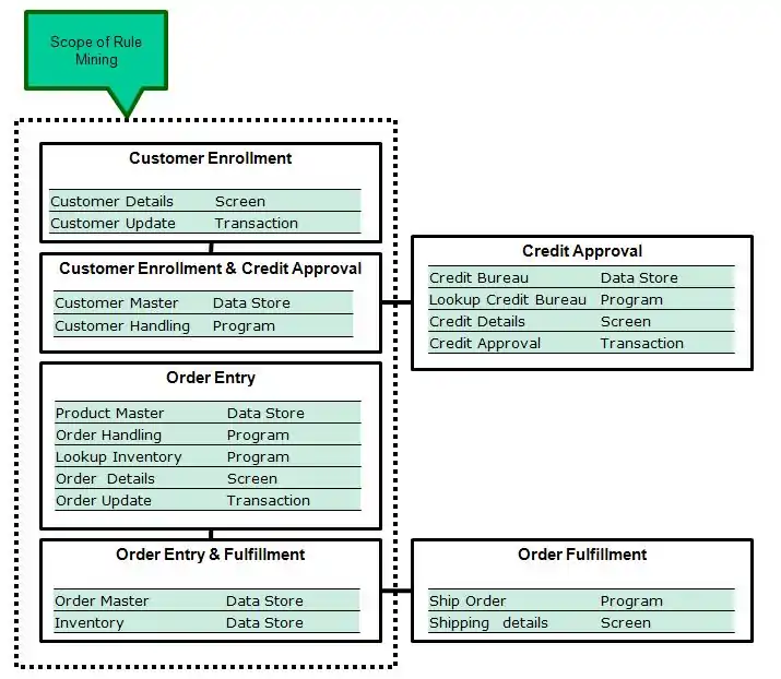 In Figure 1 below, the Customer Master, Order Master, and Inventory data stores are within the scope for rule mining despite the fact that they support additional processes outside of the scope. Similarly, the Customer Handling program is monolithic and includes logic for Credit Approval, outside of the scope of this effort.