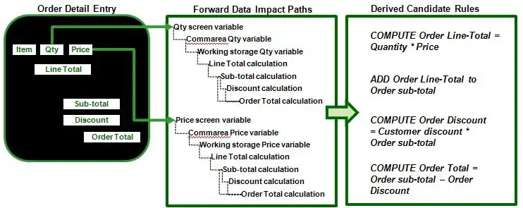 Rule mining software tools assists in this task by visualizing a data impact path forward for each seed field to each point where it is either populated by new values or used as input to other fields via comparisons, value propagation and calculations. At each such point, the tool can be used to document the underlying business rules. Automated rule detection methods can also be applied to capture each screen field edit as a candidate rule.