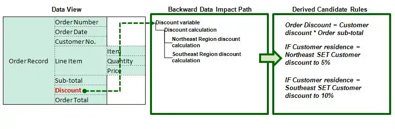 Following this approach, rules are captured by starting from an interesting data point and identifying all logic impacting that point. For example, an Order Discount field is impacted by discounts calculated upstream from it, depending on the customer's location of residence.