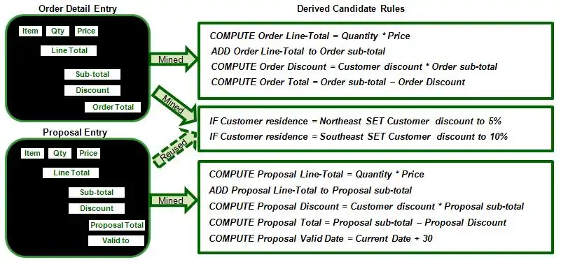 Let’s consider an extended case involving both Order Entry and Proposal Issuance processes. Adopting an exclusive bottom-up approach would have also resulted in repetition, mining rules for upstream data impacts that "hit" multiple outputs (e.g. customer discount rules). Using the hybrid approach, we would first mine rules from all outputs of the order transaction, then only outputs of the proposal transaction particular to it.