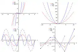 Translations and dilations can be either horizontal or vertical. Examples of both vertical and horizontal translations can be seen at right. The red graphs represent functions in their 'original' state, the solid blue graphs have been translated (shifted) horizontally, and the dashed graphs have been translated vertically.