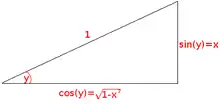 At this point we need to go back to the unit triangle. Since is the angle and the opposite side is , the adjacent side is , and the hypotenuse is 1. Since we have determined the value of based on the unit triangle, we can substitute it back in to the above equation and get: