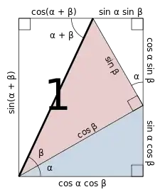 Look at the image on the right, which consists of 4 right triangles: the blue triangle, the red triangle (with a hypotenuse of 1), the upper-left triangle, and the upper-right triangle. According to the definition of trigonometric functions, the adjacent and opposite sides (respective to the notated angles) should be: