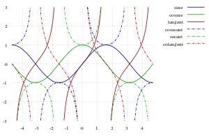 The other three basic functions are the cosecant, secant, and cotangent functions, which are the reciprocals of the sine, cosine, and tangent functions respectively. The graphs of those functions are on the right.
