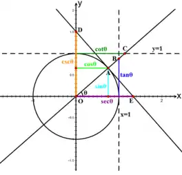 Rotating a ray from the direction of the positive half of the x-axis by an angle (counterclockwise for and clockwise for ) yields intersection points of this ray with the unit circle: , and, by extending the ray to a line if necessary, with the line and with the line The tangent line to the unit circle in point A, which is orthogonal to this ray, intersects the y- and x-axis at points and . The coordinate values of these points give all the existing values of the trigonometric functions for arbitrary real values of in the following manner:
