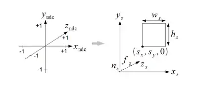 The projection transformation maps view coordinates to clip coordinates, which are then mapped to normalized device coordinates by the perspective division by the fourth component of the clip coordinates. In normalized device coordinates (ndc), the view volume is always a box centered around the origin with the coordinates inside the box between -1 and +1. This box is then mapped to screen coordinates (also called window coordinates) by the viewport transformation as illustrated in the corresponding figure. The parameters for this mapping are the coordinates and of the lower, left corner of the viewport (the rectangle of the screen that is rendered) and its width and height , as well as the depths and of the far and near clipping planes. (These depths are between 0 and 1). In OpenGL and OpenGL ES, these parameters are set with two functions: