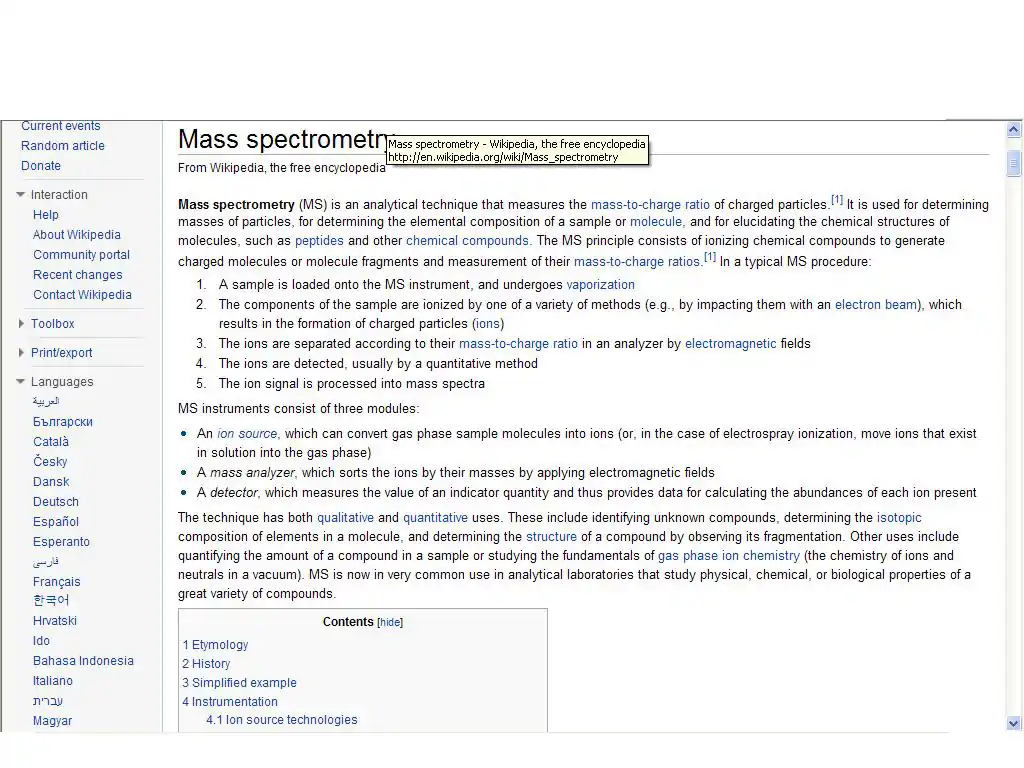 Searches for information on mass spectrometry were run on the two popular online encyclopedias below, the first on Wikipedia, and the second on Britannica Online.