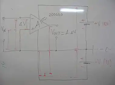 Firstly, let's remind what an operational amplifier (op-amp) is: it's a device having a differential input (it may be current, voltage, mechanical motion?!?Circuit-fantasist (talk) 18:09, 7 May 2008 (UTC), etc.) and the output that varies according to the input but with a larger amplitude. Almost always they are used with negative feedback (the output signal is returned to the input in opposite direction to the source signal). However, they may be also used with a positive feedback (the output signal that is returned is summed with the input original signal) but much rarely. For ideal OA in a negative-feedback circuit, the network returns a fraction of the output to the inverting input and thus makes the differential input voltage toward zero.