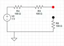 This circuit has an open between the red and black dots. No current is flowing. The electro motive force (EMF) extends from the battery + terminal through resistors 4 and 5. The EMF from the negative terminal of the battery extends through resistor 6. Thus the voltage drop between the red and black dots is the battery voltage of 1 volt.
