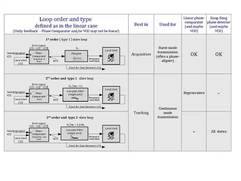 - Loops of 2nd order and of type 2 (if a linear phase comparator is used this structure is non-preferred) for applications of "regenerators" and of "end points". A detailed analysis of a linear (2.2) architecture (with all linear blocks) is still very important for the comprehension of its practical applications with a bang-bang phase detector.