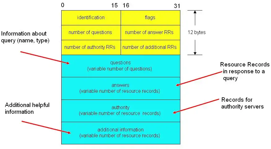 As we have finished with most of the parts of DNS, now lets look at how a DNS message looks like. The figure below provides a DNS message format. The query and response, both, are within the same message format.