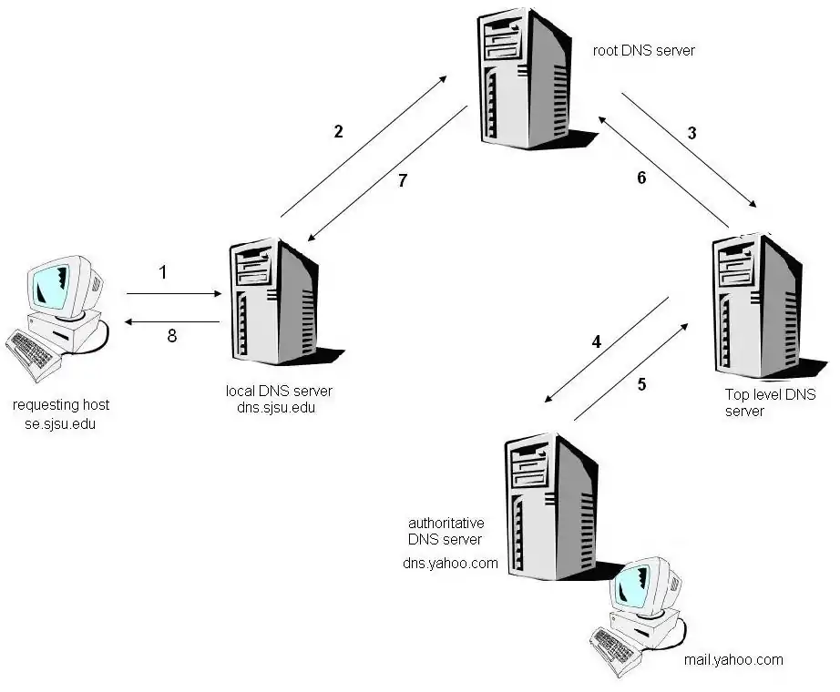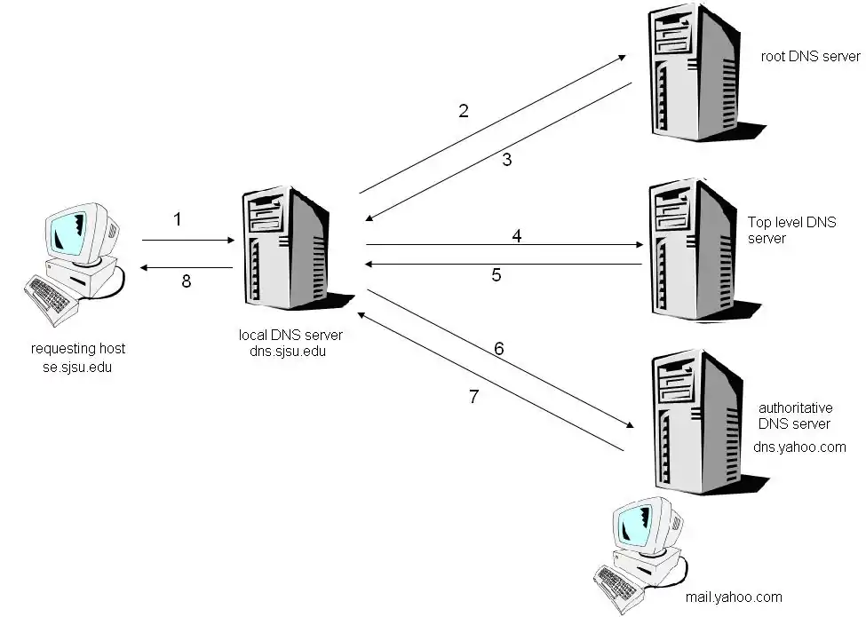 Let's have a look at how an iterative approach works. We assume that a hostname se.sjsu.edu is requesting the IP address of mail.yahoo.com. We also assume that the authoritative DNS server for mail.yahoo.com is dns.yahoo.com. The way the DNS resolves the request is shown below.