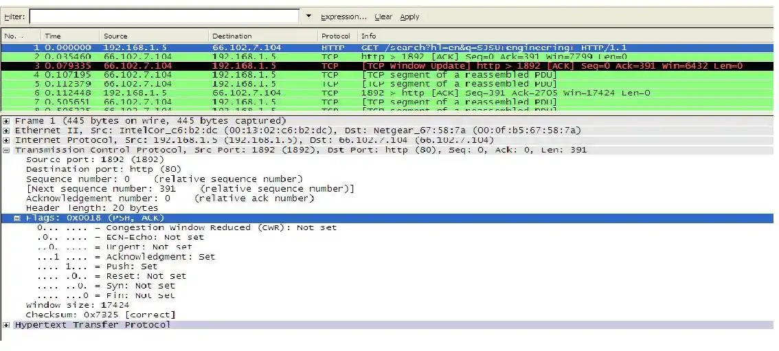 The TCP packet can be viewed using Ethereal capture. One such TCP  packet is captured and shown below. See that the ACK-flag and PUSH-flag are set to '1' in it.