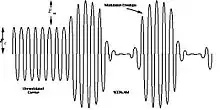 Notice that the amplitude of the high frequency carrier takes on the shape of the lower frequency modulation signal, forming what is called a modulation envelope.