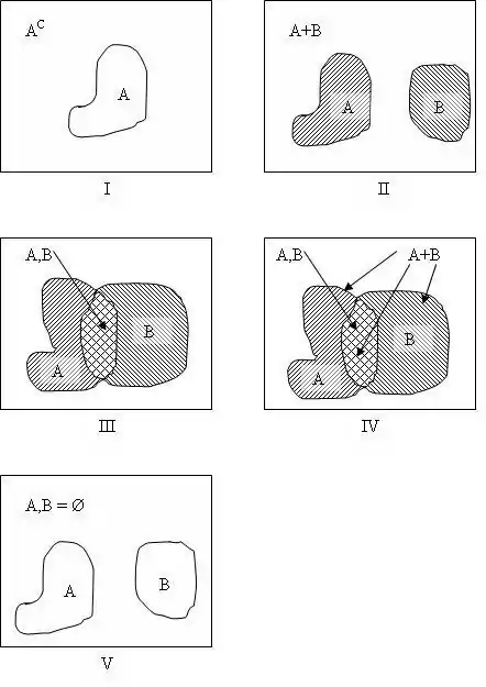 These are illustrated using the Venn diagrams below. The points in the square represent the sample space, S and those in an enclosed loop an event.