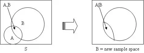 This gives the fraction of the points in B that are also in A. In effect, with knowledge of B we can create a new sample space containing only the points in B and then look for the relative frequency of the points in A that are in B,