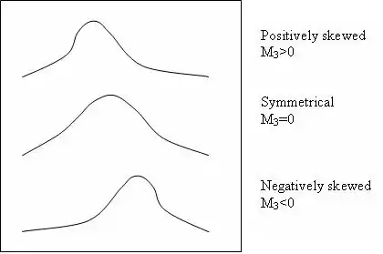 For M3 = 0 the distribution is symmetrical. For M3 > 0 it is positively skewed, and for M3 < 0 it is negatively skewed. This is illustrated below.