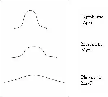 The figure below shows distributions having the same Variance, σ2 = 1, and M4 > 3, M4 = 3, and M4 < 3. For M4 > 3 the distribution is “tall and thin;” for M4 < 3 it is “flat” and for M4 = 3 it is “medium.”