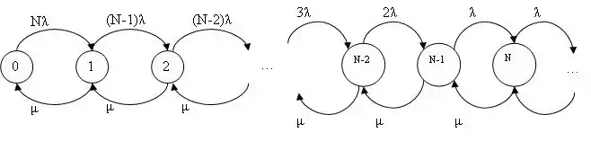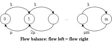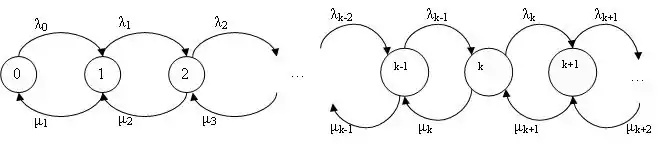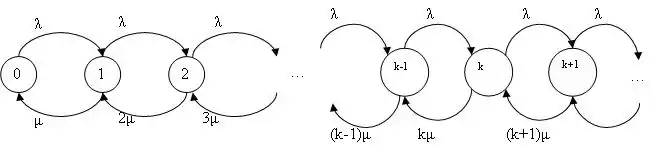 Because of the memoryless property of the Poisson process the probability that the queue is in state n=k at time t and that there is an arrival or a departure during an interval h given that the queue is in state k at the start of the interval are independent. Thus the state transition diagram below describes a Markov chain.