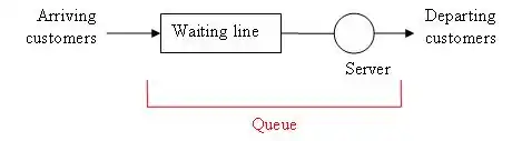 A queue is formally defined as consisting of a server and a waiting line for customers needing service at the server. Each customer joins the queue at the end of the waiting line. As the customers at the front of the line are served those behind gradually move to the head of the line. A customer leaves as soon as it has received its service requirement from the server and the server begins to serve the next customer in line. This is illustrated below.