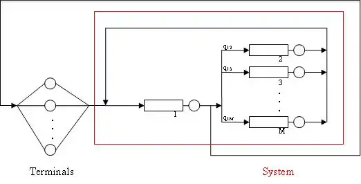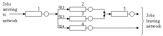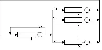 Note that a single queue can be fed from the output of several others and that the output of a queue can be split to form input streams to several other queues. Each queue forms a “node” of the network and these can be numbered 1,2…M, where M is the number of nodes in the network. The “routing probability” is the probability that a departure from node i of the network goes immediately to node j.