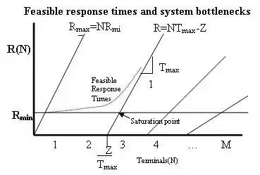 The region between is often called the feasible response time region for the system. In practice, as the number of terminals is increased, the response time becomes asymptotic to the line