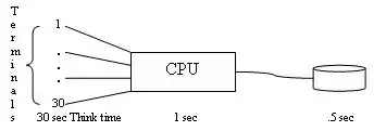 In this model the number of jobs is equal to the number of terminals (i.e., there is one job per terminal). A job is visualized as leaving the “Terminals” when the user hits a “carriage return”, circulating among the various devices in the system as it is processed, and then returning to the terminal node. The time from the job’s departure from the terminal node until its return is the system response time. The time that the job waits at the terminals (i.e., the time from a response until the next input to the system) is the user “think time”.