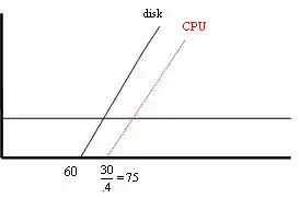 This is the leftmost of the lines , and the one for which is the largest. The device corresponding to this line is called the system bottleneck and the other lines for the other devices are the potential bottlenecks due to those devices. The bottleneck and potential bottlenecks above are easily located. Observe that each is a straight line with an intercept on the horizontal (terminal) axis of and a slope of . Since gets smaller as the lines progress from left to right they have the appearance of “falling down”.