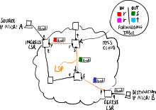 - fast fault recovery: two paths between a pair of nodes can be created, so that in case of failure in the first path the LSR can just notify the failure and quickly deviate the traffic to the second path[1] (instead in IP it is difficult to insert two paths into a routing table, and if a link fails routers need to exchange routing information and perform sophisticated algorithms to find another path).