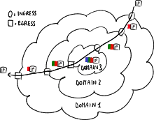 A Label Switched Path (LSP) is a path set up by a signaling protocol that links a source label edge router (ingress) to a drain one (egress):