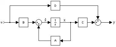 Now, we will derive the I/O relationship into the state-space equations. If we examine the inner-most feedback loop, we can see that the forward path has an integrator system, , and the feedback loop has the matrix value A. If we take the transfer function only of this loop, we get: