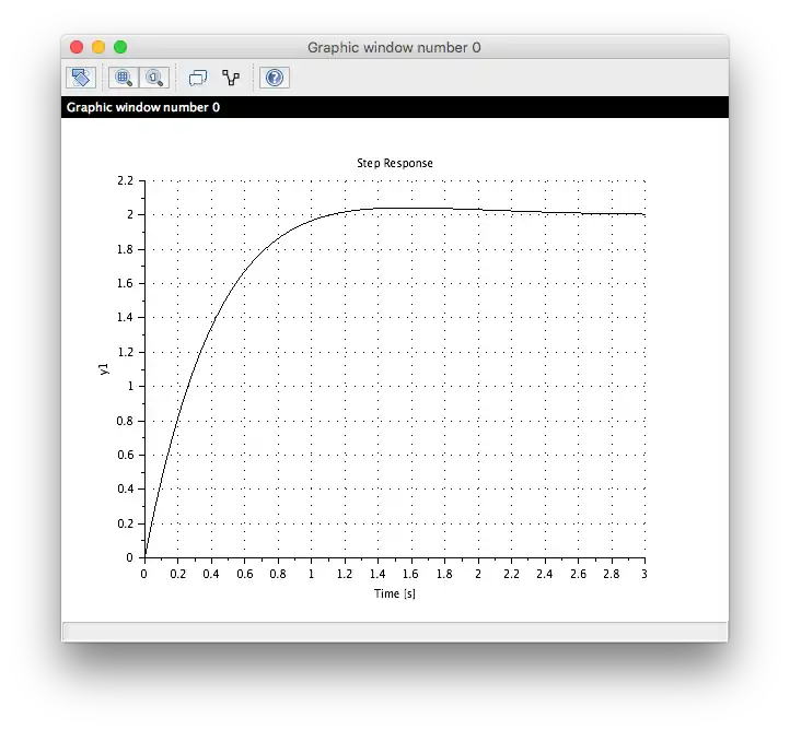 plot2d(t, csim('step',t,TF));       // csim applies the step test and plot2d produces the graphical output