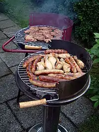 Backyard grilling is sometimes used synonymously for 'barbecuing', though it is one method of barbecuing. Barbecuing actually encompasses three distinct types of cooking techniques. One type is charbroil-grilling over direct dry heat on a ribbed surface, usually a hot fire (i.e., over 500°F) for a short time (minutes). A similar technique is griddling over direct dry or moist heat (sometimes with the additions of oils and butter) on a flat surface over a hot fire, at the same pace as charbroiling. Grilling and griddling may be done over wood, charcoal, gas (natural gas or propane), or electricity. Another technique is braising, which combines direct dry heat charbroil-grilling on a ribbed surface with a broth-filled pot for moist heat, cooking at various speeds throughout the duration (starting fast, slowing down, then speeding up again, lasting for a few hours). The other technique is cooking by using indirect heat or low-level direct radiant heat at lower temperatures (usually around 240°F) and significantly longer cooking times (several hours), often with smoke.