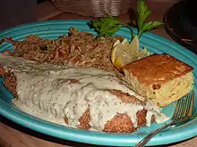 Fried catfish served with rice, corn, and bread in New Orleans, Louisiana