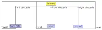 A finite state automaton (FSM)[5] is a model of behavior. It's a possible way to program a robot controller. It's composed of a finite number of states and of some transitions between them. In our case, the states correspond to a configuration of the robot actuators (the wheels speed and the LEDs state), while the transitions correspond to a condition over the sensor values (the IR sensors and the camera), i.e., under which condition the automaton can pass from one state to another. One state is particularly important: the initial state. It's the state from where the simulation begins. During this curriculum, an automaton will have the same signification as an FSM.