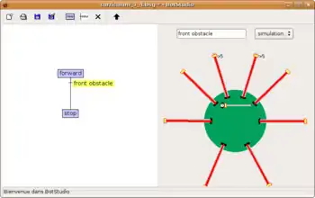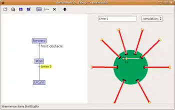 You already learned what a robot controller is. In the following exercises you will create simple behaviors by using a graphical programming interface: BotStudio. This module is integrated in Webots. The aim of this exercise is to introduce BotStudio by discovering the e-puck's movement possibilities.