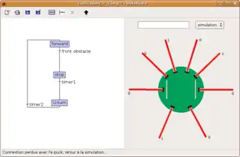 BotStudio enables you to create graphically an automaton. When an automaton is created, you can test it on your virtual or real e-puck. You will observe in the following exercises that this simple way to program enables to create a large range of behaviors.