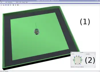 - The simulation window (1): This window is probably the most important one. It shows a 3D representation of the simulation. In our case, you can see a virtual e-puck and its virtual environment. If you want to modify the camera orientation, just click and drag with the left button of the mouse where you want in the panel. Similarly you can modify the position of the camera by using the right button (Note for the Mac OS X users : if you have a mouse with a single button, hold down the Ctrl key and click for emulating the right click.). Finally you can also set the zoom by moving the mouse wheel. There are also two important buttons in this window: the play/stop button and the revert button. With the first one, the simulation can be either played or stopped, and with the second one, the entire simulation can be reset.