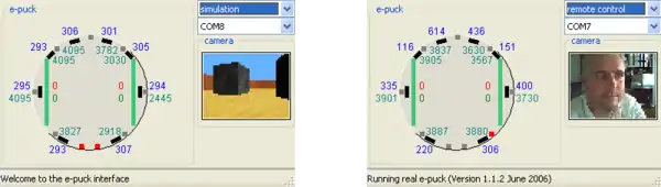 Finally, the fourth stage is the transfer to a real robot. Your control program will be transferred into the real robot running in the real world. You could then see if your control program behaves the same as in simulation. If the simulation model of your robot was performed carefully and was calibrated against its real counterpart, the real robot should behave roughly the same as the simulated robot. If the real robot doesn't behave the same, then it is necessary to come back to the first stage and refine the model of the robot, so that the simulated robot will behave like the real one. In this case, you will have to go through the second and third stages again, but mostly for some little tuning, rather than redesigning your program. The figure with two windows shows the e-puck control window allowing the transfer from the simulation to the real robot. On the left hand side, you can see the point of view of the simulated camera of the e-puck robot. On the right hand side, you can see the point of view of the real camera of the robot.