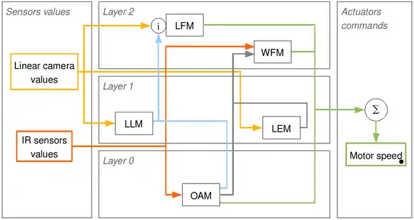 - LEM: Its role is to remove the inhibition on the LFM when it detects a black line. Moreover, it has to inform the WFM that is has to stop following the wall.